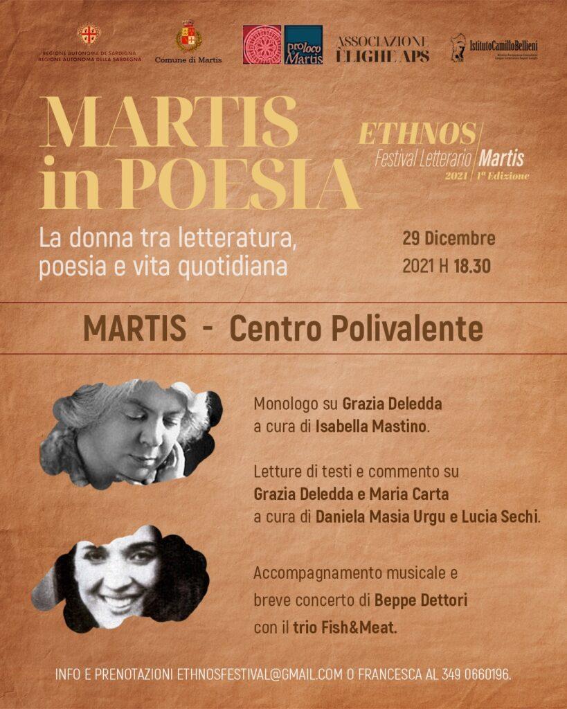 MARTIS. “Il ruolo della donna nella letteratura, nella poesia e nella vita quotidiana”, è questo il tema della quinta edizione di “Martis in poesia”, che mercoledì 29 dicembre alle 18.30, ritorna nel Centro Polivalente del piccolo paese dell’Anglona, con un focus in particolar modo incentrato su due straordinarie icone femminili dell’isola, Grazia Deledda e Maria Carta.
