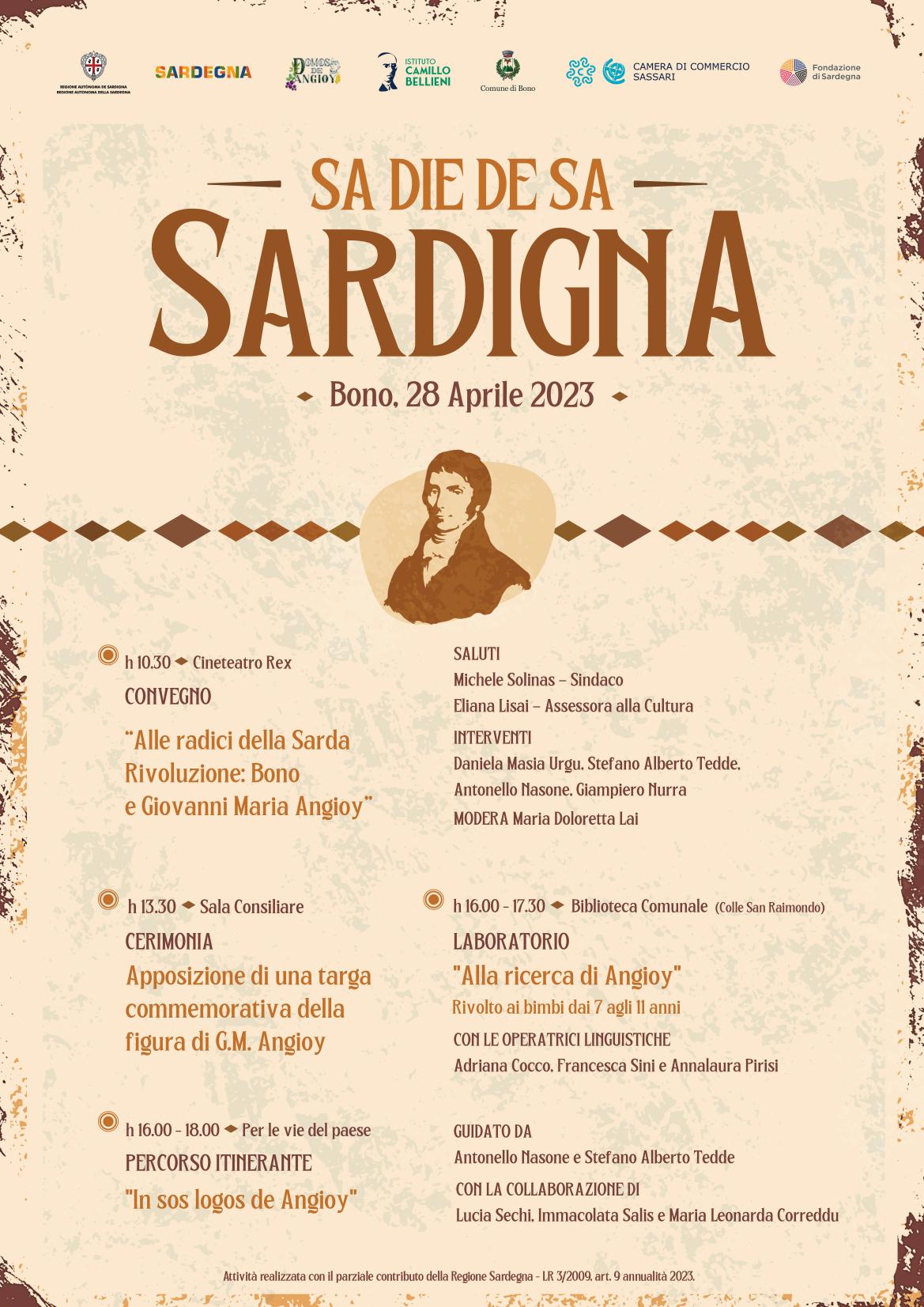 PROGRAMMA. Alle 10.30 al Cineteatro Rex si terrà il convegno intitolato “Alle radici della Sarda Rivoluzione: Bono e Giovanni Maria Angioy”, con i saluti istituzionali del sindaco Michele Solinas e dell’assessora alla Cultura Eliana Lisai. Alla tavola rotonda moderata da Maria Doloretta Lai interverranno Daniela Masia Urgu, che presenterà “Il progetto In sos logos de Angioy. Diario di un viaggio rivoluzionario”; Stefano Alberto Tedde, che esporrà “Il contesto storico e i documenti d’archivio rinvenuti nel corso della ricerca”; Antonello Nasone con la relazione “Angioy e il significato etico-politico della Sarda-Rivoluzione”. L’intervento conclusivo è affidato a Giampiero Nurra, presidente dell’Associazione culturale “Bono per Giovanni Maria Angioy”.