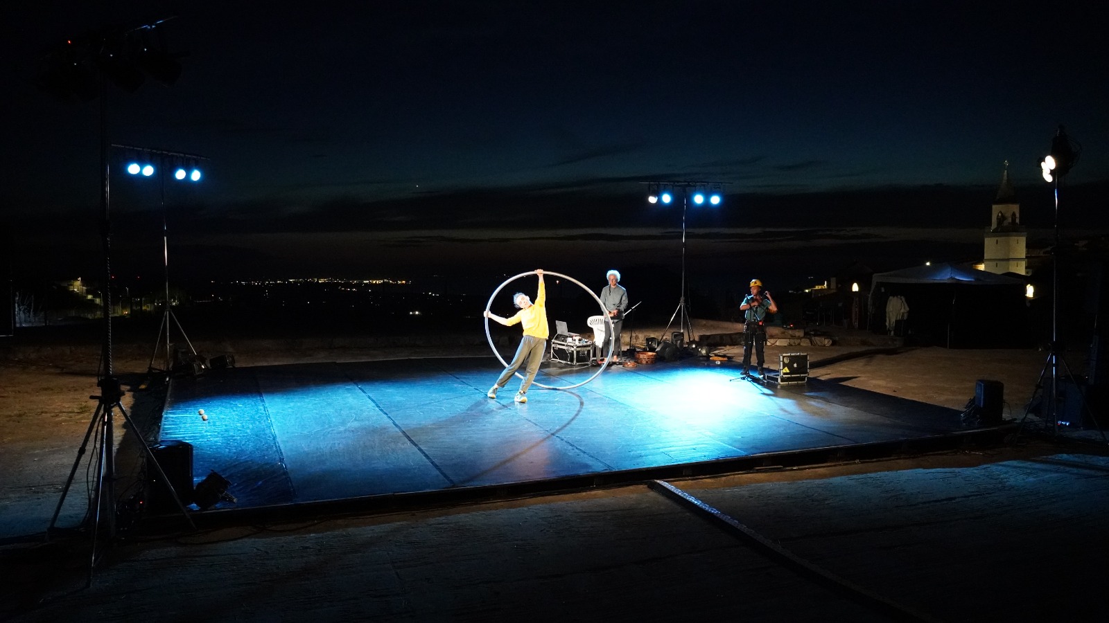 Dal movimento acrobatico all’interno di un cerchio gigante allo slacciarsi le scarpe facendo roteare al contempo diverse palline con le mani, nel corso dello spettacolo sono state tante le prove di abilità molto gradite e applauditissime dagli spettatori. Le performance sono state impreziosite dall’accompagnamento musicale dal vivo di Pino Basile, per una produzione Spellbound realizzata con il contributo del Ministero della Cultura, in cui a condividere lo spazio sono un musicista sperimentale e un circense sperimentatore.
