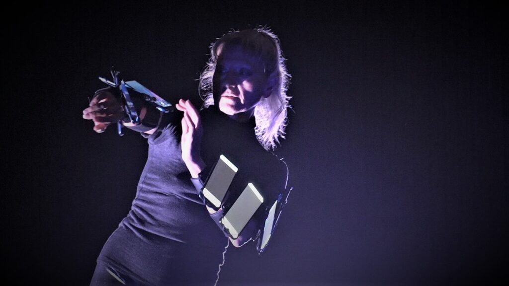PORTO FERRO. Un corpo-clone si muove come un automa concepito per essere in ascolto, reattivo alle comunicazioni trasversali. Le braccia si protendono come antenne imbrigliate di cellulari, che ricordano file di ripetitori tv pronti a trasmettere e ricevere in contemporanea. Si presenta così “Elle_Live solo” di Ariella Vidach sul palcoscenico del Baretto di Porto Ferro per il festival Corpi in movimento organizzato da Danzeventi, tra fredde rifrazioni luminose smorzate di blu e uno sfondo musicale ipnotico e serrato. La sua danza sembra suggerire il futuro che ci aspetta, o forse un più drammatico presente, esibito all’interno di una rappresentazione iperbolica che non vuole fare sconti.