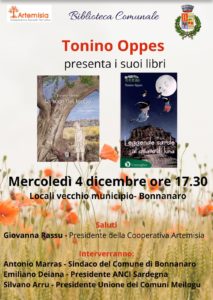 Si prosegue poi il 4 dicembre alle 17.30, nei locali del vecchio municipio di Bonnanaro, con la presentazione dei libri di Tonino Oppes “Leggende sarde al chiaro di luna” e “La voce del Leccio”. Interverranno per l’occasione il sindaco Antonio Marras, il presidente Anci Sardegna, Emiliano Deiana, e il presidente dell’Unione dei Comuni del Meilogu, Silvanu Arru.