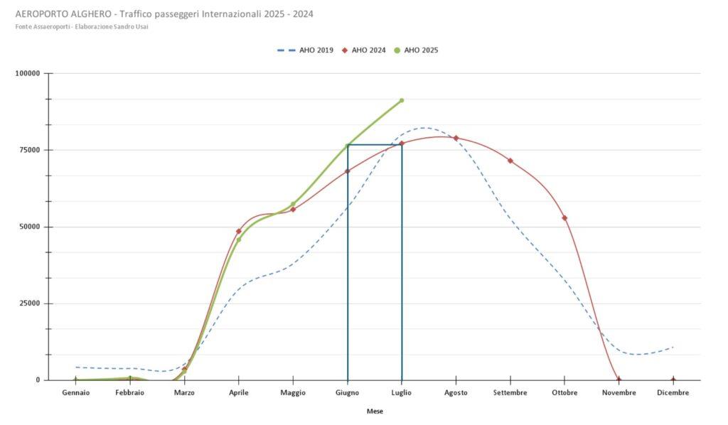 Il grafico dedicato allo scalo della riviera del corallo parla chiaro: a giugno 2025 Alghero aveva già raggiunto i volumi di traffico che lo scorso anno si erano toccati solo a luglio. Un mese di anticipo che ribalta le percezioni negative diffuse tra operatori turistici e cittadini, che per mesi avevano criticato la gestione dell’aeroporto.