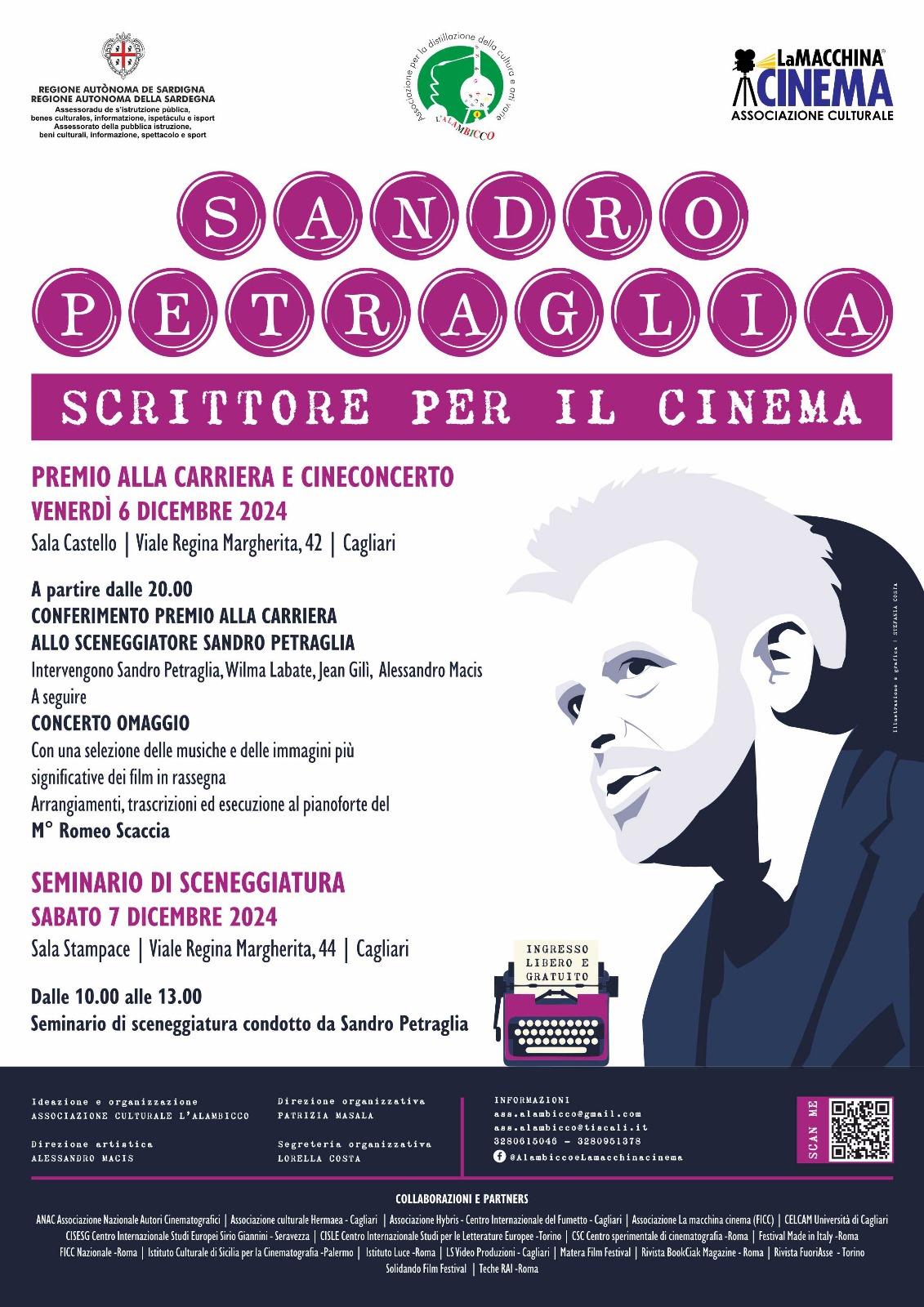 Cagliari. Sandro Petraglia è considerato uno dei più importanti e prolifici sceneggiatori italiani, con una vasta filmografia e innumerevoli collaborazioni con alcuni dei più rappresentativi registi italiani. Venerdì 6 dicembre alle 20 Petraglia farà il suo ingresso nella Sala Castello dell’hotel Regina Margherita (viale Regina Margherita 42 – accesso esterno all’hotel), a Cagliari, dove parteciperà alla cerimonia di conferimento del Premio alla Carriera. Un premio che l’associazione culturale L’Alambicco destina ogni anno a figure prestigiose del cinema. Lo hanno già ricevuto personalità del calibro di Rosi, Monicelli, Cavani, Scola, Avati, Faenza, Leconte, Saura, Verdone, Amelio, Sartoria Tirelli, Labate, Antonutti, e altri. Nel corso della serata lo sceneggiatore verrà omaggiato con un concerto eseguito al pianoforte dal maestro Romeo Scaccia, e quindi dialogherà con il pubblico rispondendo alle domande dello storico e critico cinematografico francese Jean Gili, della regista Wilma Labate e del presidente dell’Alambicco Alessandro Macis.