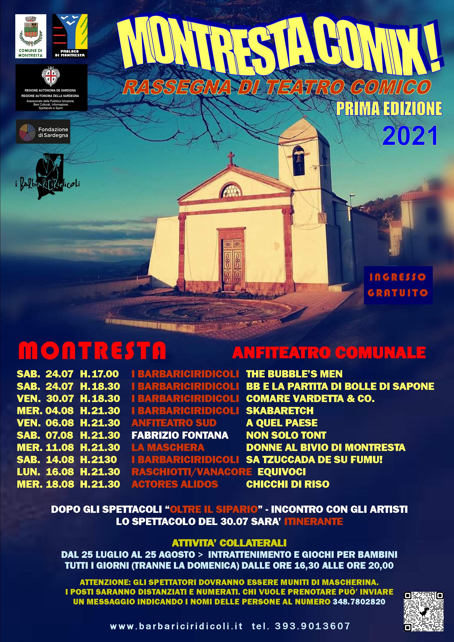Sbarca a Montresta la comicità targata Barbariciridicoli con una rassegna di teatro comico che si articolerà in dieci spettacoli di ilarità e leggerezza, ma anche di riflessione sulle tematiche più sentite dei nostri tempi. Con il contributo della amministrazione comunale guidata da Salvatore Salis e della Proloco locale, si darà avvio alla manifestazione oggi, sabato 24 luglio con i primi due spettacoli in programma all’anfiteatro comunale.