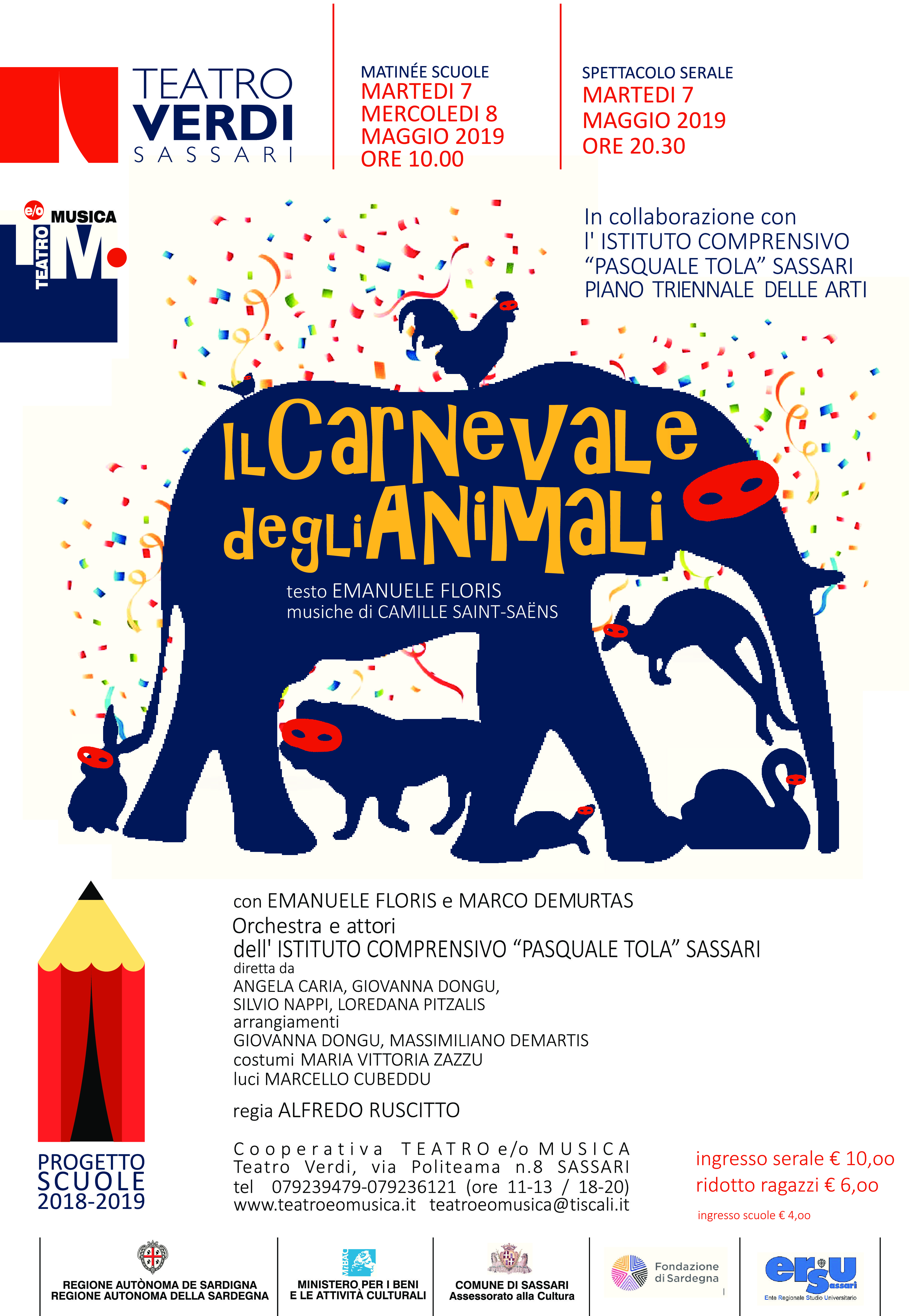 Prosegue al Teatro Verdi martedì 7 maggio alle 20,30 la stagione organizzata dalla cooperativa Teatro e/o musica dedicata alle scuole con lo spettacolo “Carnevale degli animali” tratto all’opera omonima di Camille Saint-Saëns. I testi di Emanuele Floris rivivono le musiche originali di Camille Saint-Saëns con gli arrangiamenti di Giovanna Dongu, e Massimiliano Demartis e i Costumi di Maria Vittoria Zazzu. Lo spettacolo che vede sul palco Emanuele Floris e Marco Demartis è organizzato in collaborazione con l’Istituto Comprensivo Pasquale Tola. L’ Orchestra degli alunni delle classi 3^A e 3^H ad indirizzo musicale sarà diretta da: Angela Caria, Giovanna Dongu, Silvio Nappi, Loredana Pitzalis. Luci Marcello Cubeddu, Regia Alfredo Ruscitto.