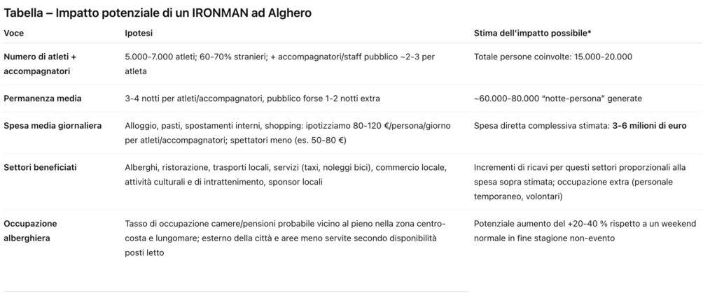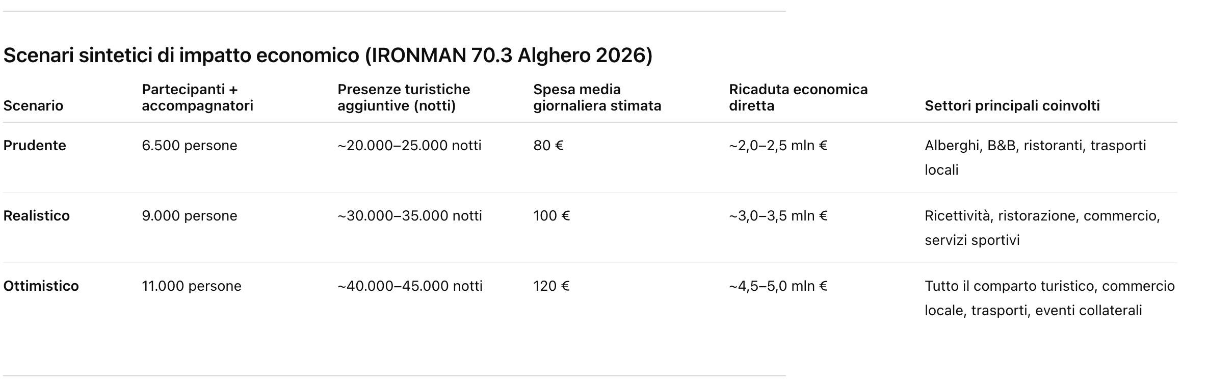 Per valutare con precisione le ricadute dell’IRONMAN 70.3 su Alghero, si utilizzeranno parametri consolidati nel turismo sportivo: