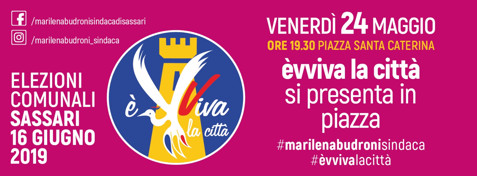 Venerdi 24 Maggio 2019, alle ore 19.30 in piazza S. Caterina a Sassari, i candidati e le candidate della lista civica “èvviva la citta’” con Marilena Budroni sindaca, si presentano ai cittadini e presentano il programma elettorale per il governo di Sassari.