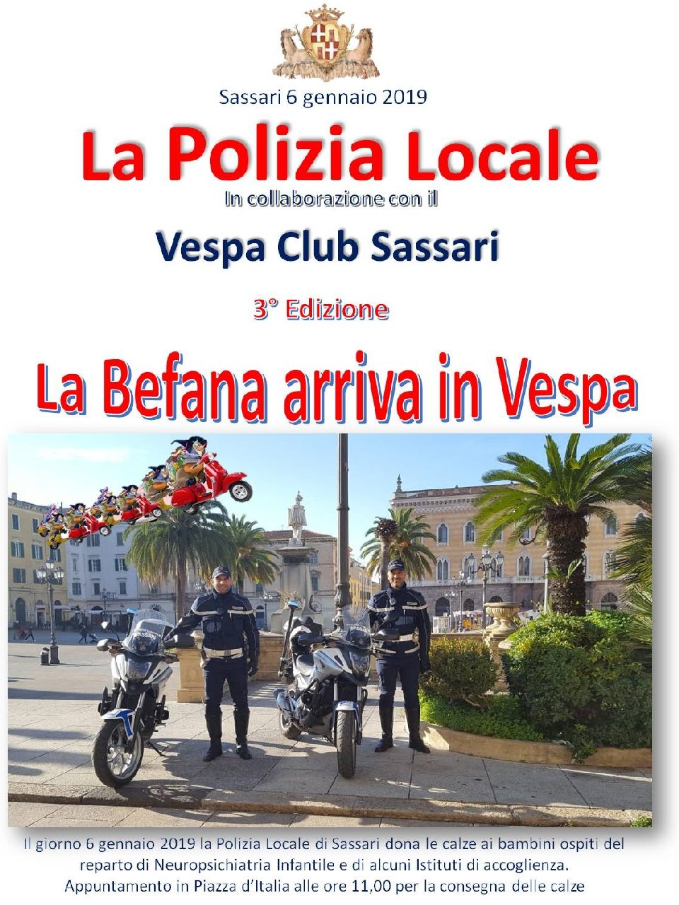 Domenica 6 gennaio la Polizia locale di Sassari e l’associazione Vespa Club riproporranno la festa della Befana in piazza d’Italia con i bambini ospiti di alcune strutture protette presenti in città. Cinquanta tra bambini e bambine saranno accompagnati con un autobus messo a disposizione dall’Atp in piazza d’Italia dove, nello stand allestito dal Comando, gli agenti della polizia locale distribuiranno le calze della Befana. Numerose altre calze saranno consegnate ai piccoli che affolleranno piazza d’Italia.