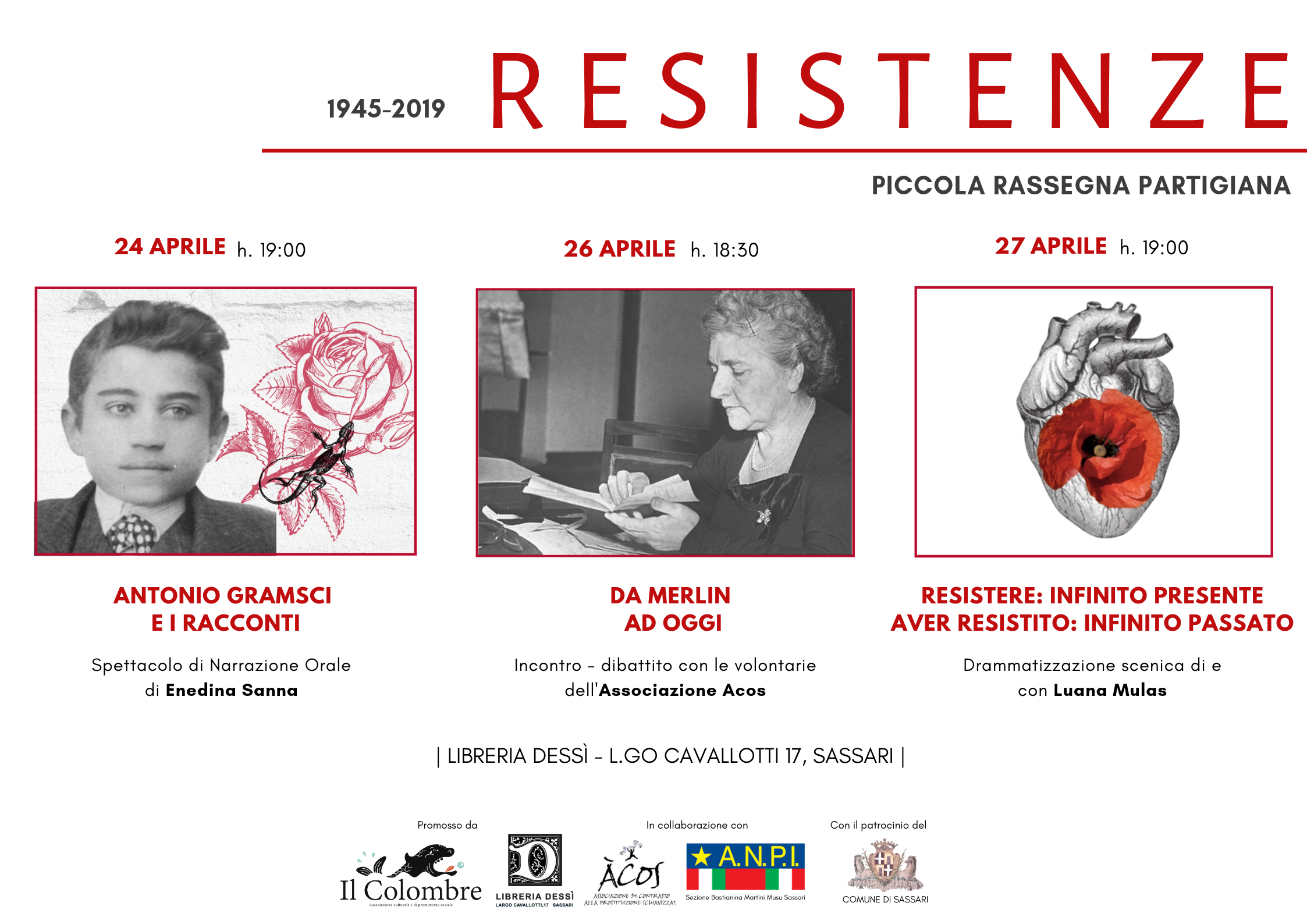 Comincia mercoledì 24 Aprile “Resistenze piccola rassegna partigiana”, tre serate legate dal filo rosso dell’antifascismo e dai valori della resistenza. La rassegna è organizzata dall’Associazione Culturale Il Colombre in collaborazione con la Libreria Dessì, Anpi Sassari e l’associazione Acos, con il patrocinio del Comune di Sassari, rientra nel percorso cittadino in vista delle celebrazioni per il 25 Aprile.