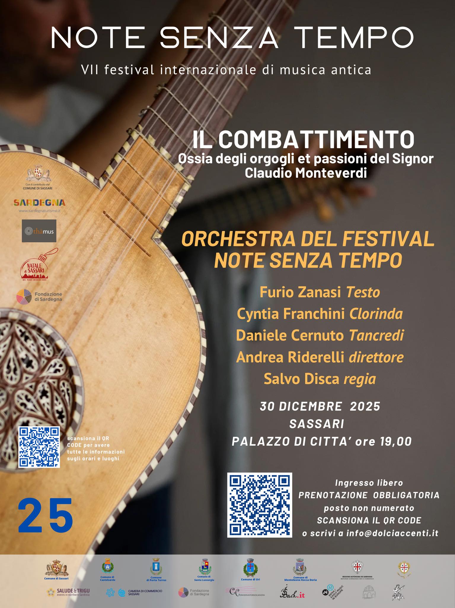 SASSARI. Martedì 30 dicembre, alle 19.30, al Teatro Civico di Sassari, l’orchestra del festival di musica antica “Note senza tempo” presenta “Il combattimento. Ossia degli orgogli et passioni del Signor Claudio Monteverdi”, ultimo concerto del 2025 e prima vera produzione musicale interamente firmata dall’associazione Dolci Accenti in forma scenica.