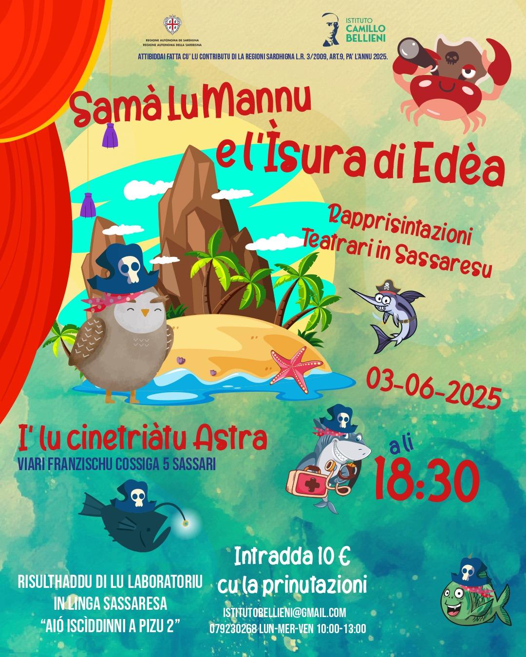 SASSARI. Il teatro come una marea che trascina il pubblico a bordo di un magico veliero, e a bordo la scoperta di simpatici pirati che parlano una lingua incomparabile: il Sassarese. Martedì 3 giugno, alle 18, all’Astra di Sassari, dopo il grande successo dello scorso anno, ritorna lo spettacolo teatrale “Samà lu mannu” promosso dall’Istituto Camillo Bellieni che coinvolge bambini dagli otto ai dodici anni, stavolta con nuove esilaranti avventure che conducono a “L’Ìsura di Edèa”.