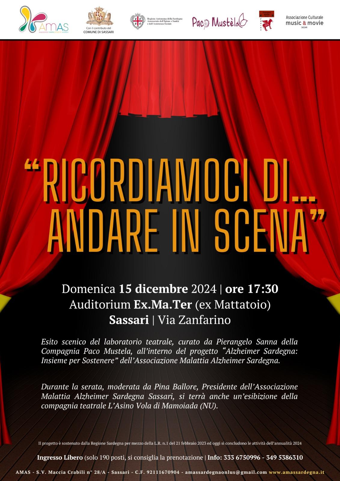 SASSARI. Domenica 15 dicembre alle 17.30 all’Auditorium Ex.Ma.Ter (ex mattatoio) di Via Zanfarino a Sassari, l’Associazione Malattia Alzheimer Sardegna – Sassari presenta “Ricordiamoci di… andare in scena!”, l’esito scenico del laboratorio teatrale curato da Pierangelo Sanna della Compagnia Paco Mustela, che fa parte del progetto “Alzheimer Sardegna: Insieme per Sostenere”. L’iniziativa è organizzata da AMAS–Sassari e sostenuta dall’assessorato dell’Igiene e Sanità e dell’Assistenza sociale e dalla Regione Autonoma della Sardegna, LR 1 del 21 febbraio 2023, con il patrocinio del Comune di Sassari. L’ingresso è libero e gratuito.