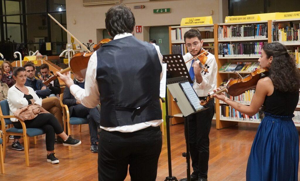 SENNORI. Musica da camera e moscato. Un abbinamento di eccellenza che ha rapito il pubblico della Biblioteca comunale nella serata d’apertura dei festeggiamenti novembrini per i 50 anni del Moscato DOC Sorso-Sennori. La “Musica d’autunno” proposta dal Trio Kadossène di Cagliari, formato da Silvia Congia e Mauro Farci al violino e Tommaso Delogu alla viola, con il suo alternare vivacità e malinconia ha regalato ai presenti emozioni in qualche modo assimilabili alle fasi della vendemmia e della vinificazione.