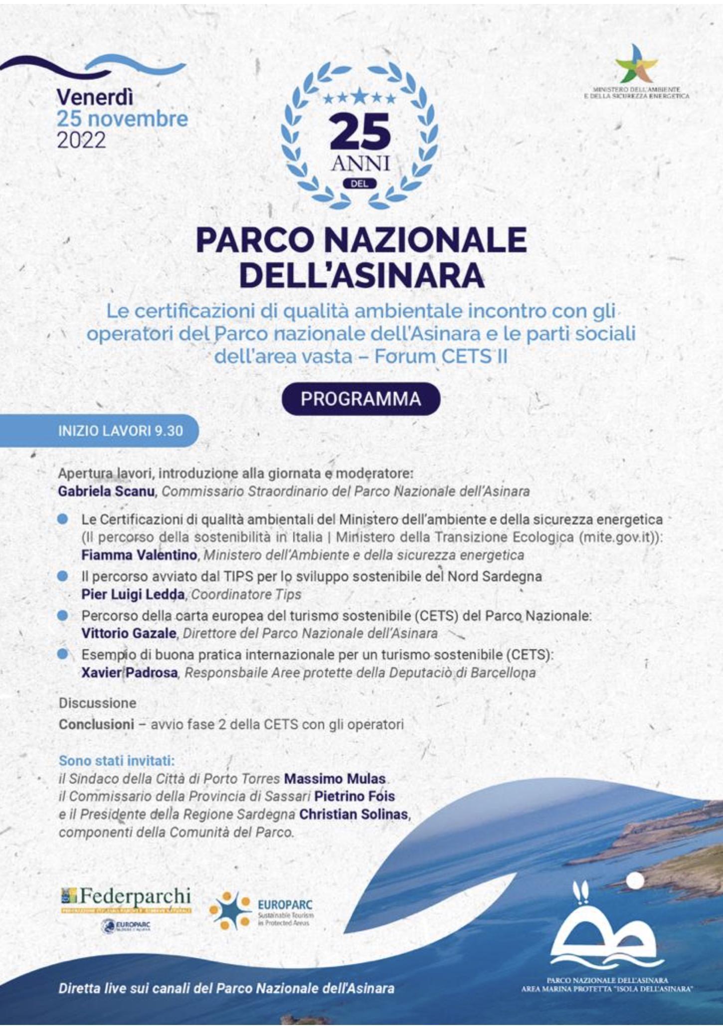la presente per invitarvi alle due giornate dedicate alle celebrazioni dei 25 anni del Parco Nazionale dell’Asinara, la prima domani 25 novembre alle ore 9.30 presso la sede istituzionale del Parco in via Ponte Romano n. 81 a Porto Torres dedicata al Forum della Carta Europea per lo sviluppo sostenibile CETS II con interventi da parte di funzionari ministeriali, di Federparchi e della Cets internazionale.