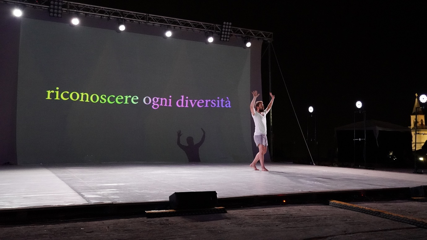 Il coreografo della compagnia Chiasma ha proposto un evento coreutico sperimentale, suscitando curiosità e stupore e superando di gran lunga le aspettative di chi ben conosce lo spirito dei lavori di questo straordinario artista performativo di origini siciliane. Pulsazioni sonore techno beat con innesti synth pop, i movimenti e lo sguardo del performer che invitano a seguirlo, cuffie alle orecchie e infine cartelloni con frasi profondamente introspettive.