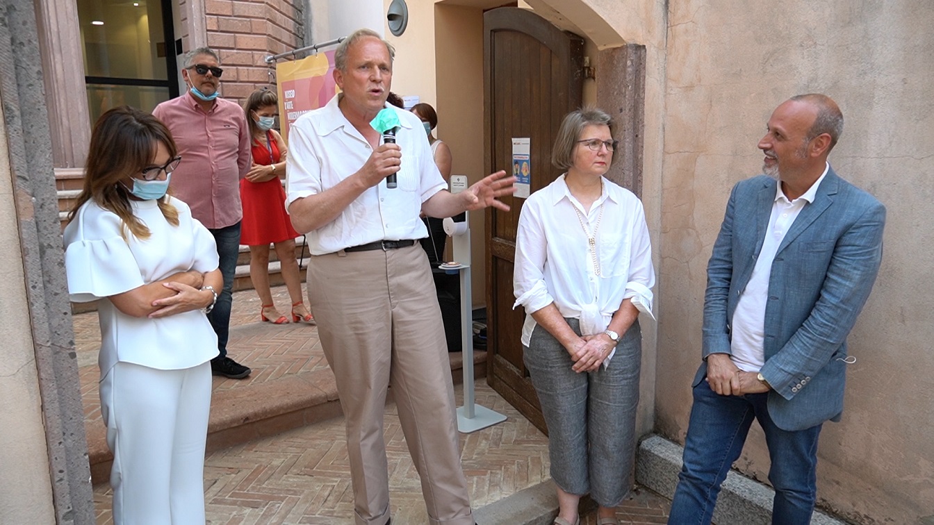 Al fianco di Tukur sono intervenuti il sindaco Alessandro Corona, Cinzia Littera in rappresentanza della cooperativa Progetto Cultura, e i curatori dell’esposizione, Sabina Corriga e Antonello Carboni, in quali hanno approfondito i dettagli di un’iniziativa che in principio era sembrata a dir poco pazzesca. Prima di immergersi nelle sale della galleria, tra i colori accesi delle grandi tele di Scheurlen, Tukur ha ricordato la sua prima avventura nell’isola, nel lontano 1982, quando da giovane studente era sbarcato a Oristano sulle tracce di suo nonno, per essere accolto nella casa del pittore Antonio Corriga, di cui fino ad allora conosceva soltanto il nome. Erano altri tempi, per quanto non troppo lontani. Allora quel piccolo villaggio di Atzara gli era sembrato perduto nel tempo, in una dimensione arcaia e dai ritmi quasi medievali.