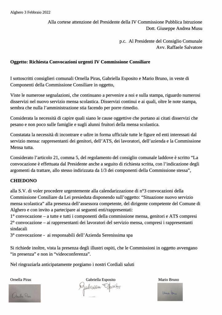 Le ripetute lamentele e le prese di posizione forti come quelle assunte dai genitori della scuola primaria di Fertilia avrebbero dovuto suggerire di convocare ben prima la commissione consiliare e spiace che, a fronte, di una nostra puntuale richiesta venga invece differito il coinvolgimento in forma istituzionale di tutti gli attori e gli enti coinvolti: rappresentanti dei genitori, dei lavoratori, dell’Azienda Sanitaria e dell’impresa che svolge il servizio.