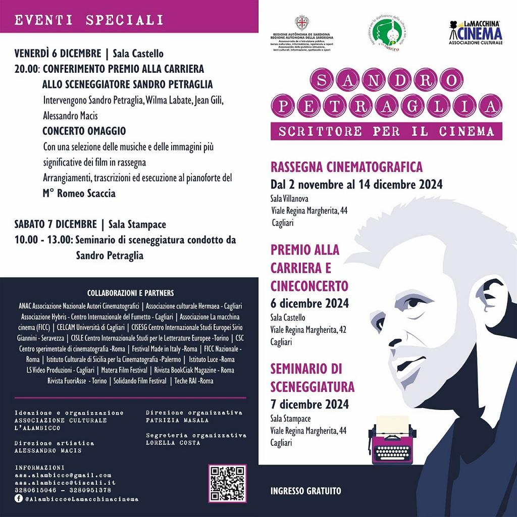 Sabato 7 dicembre, dalle 10 alle 13, il maestro terrà un seminario di sceneggiatura nella Sala Stampace (viale Regina Margherita 44). L’ingresso è libero e gratuito per tutti gli eventi. Per gli organizzatori è stato di fondamentale importanza offrire al pubblico appassionato di cinema, a scrittori e registi, a studenti delle scuole superiori e universitari, l’opportunità di confrontarsi con Petraglia in persona.